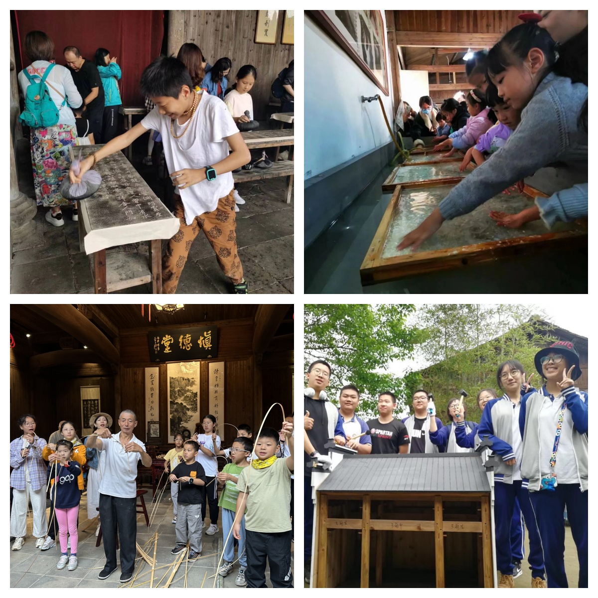 唐模景区以践行陶行知“生活教育”理论为出发点,挖掘徽州文化厚重的课程资源,整合推出“碑刻拓片”、“徽州竹编”、“古建搭建”、“宣纸制作”等研学主题产品。同时利用周边活动基地茶园、盆景园等资源,围绕“劳动教育+研学旅行”实践,开展实景教学、乡情民俗、素质拓展等富有针对性的研学体验活动,将唐模的历史文化、自然风光与教育实践完美结合。在这里,孩子们不仅可以深入领略徽文化魅力,拓展视野、增长见识,更能够得到创新精神和实践能力的培养,激发热爱祖国、热爱文化的情感与责任担当。