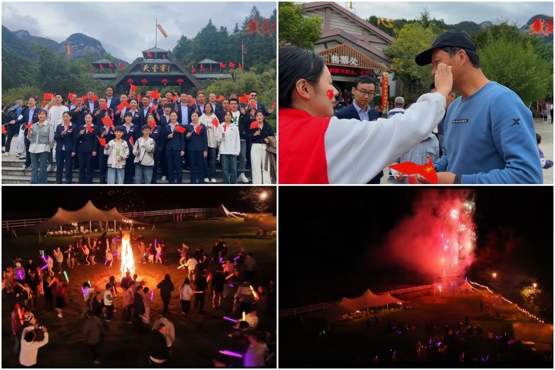秋风秋景秋醉人,欢歌笑语绘华章。国庆期间,天堂寨景区张灯结彩,五星红旗迎风招展,一派喜庆祥和的景象。景区工作人员统一着装,面带微笑,免费为游客发放小国旗、脸贴、镂空打卡牌、金秋书签等小礼品,让游客充分感受到了景区的热情和节日的气氛。10月1日至4日,景区在游客中心举办“国庆天天乐”活动,“同唱国歌为祖国献礼”“烟火璀璨、庆?;薄靶强章队?、品味吊锅”“我把秋天带回家”等多个节庆活动热闹纷呈,为新中国成立75周年献礼。