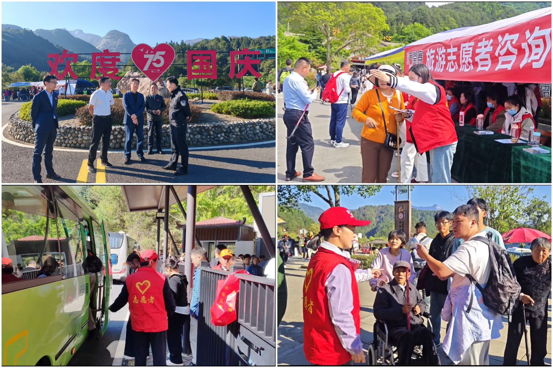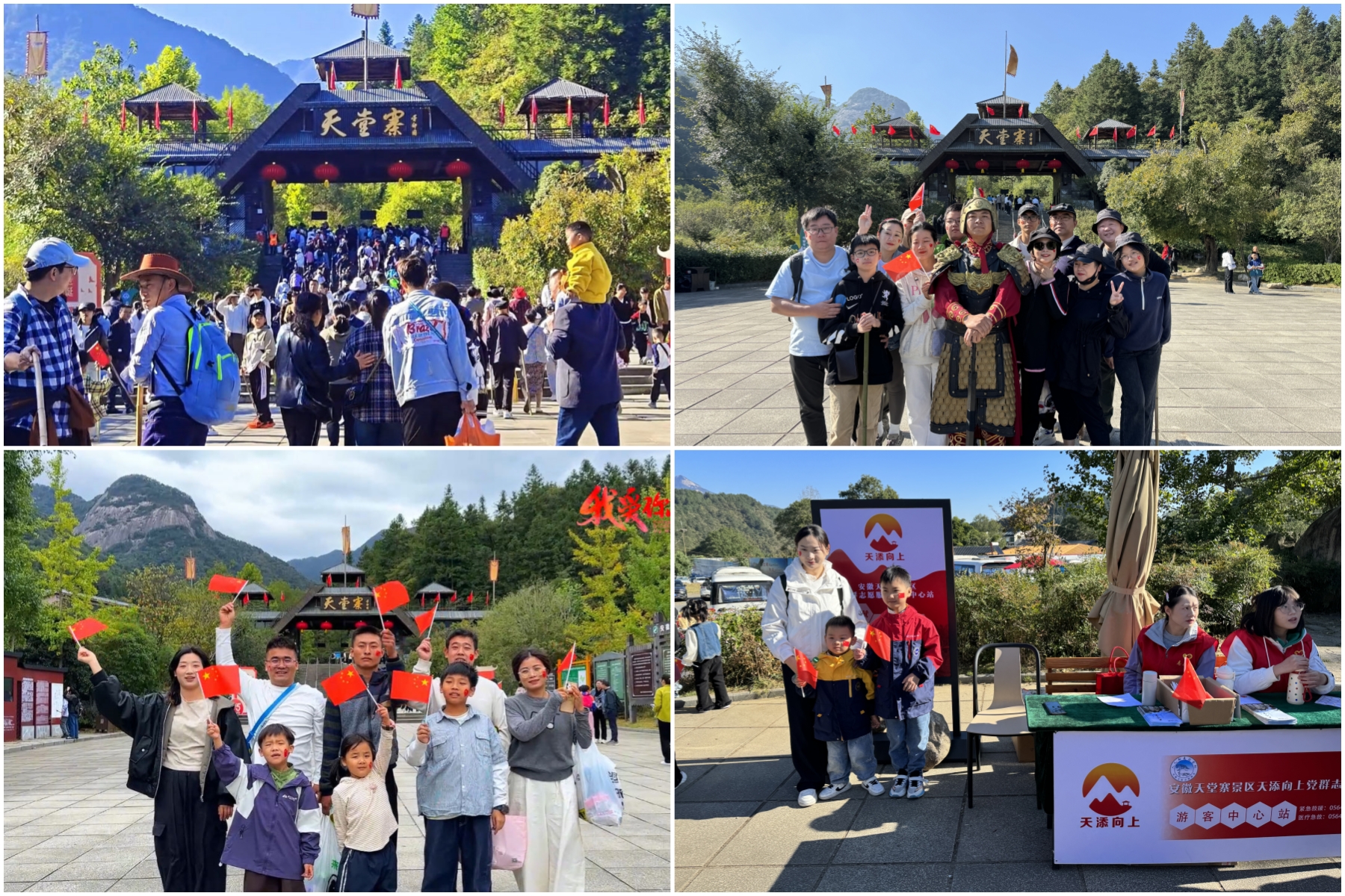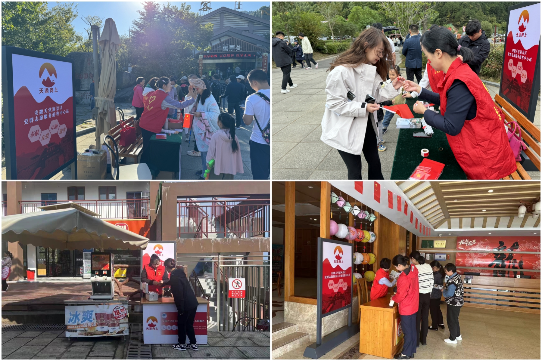 景区积极贯彻“游客至上”的服务理念,倡导”人人都是迎客松”, 打造文明旅游新高地。在停车场、游客中心、虎行地、索道、山庄等多个节点设置“天‘添’向上”党群志愿服务站点。聚焦“提服务、展形象、保安全”要求,想游客之所想,急游客之所急,为游客提供热心、暖心的咨询、救助、引导等贴心服务。十一期间,景区“天‘添’向上”党群志愿服务站点每日提供咨询服务1000余人次,共计帮助游客寻回遗失物品40余件,寻找失散游客12起,帮助一对迷路的湖北母女安全返回,受到游客高度赞扬。
