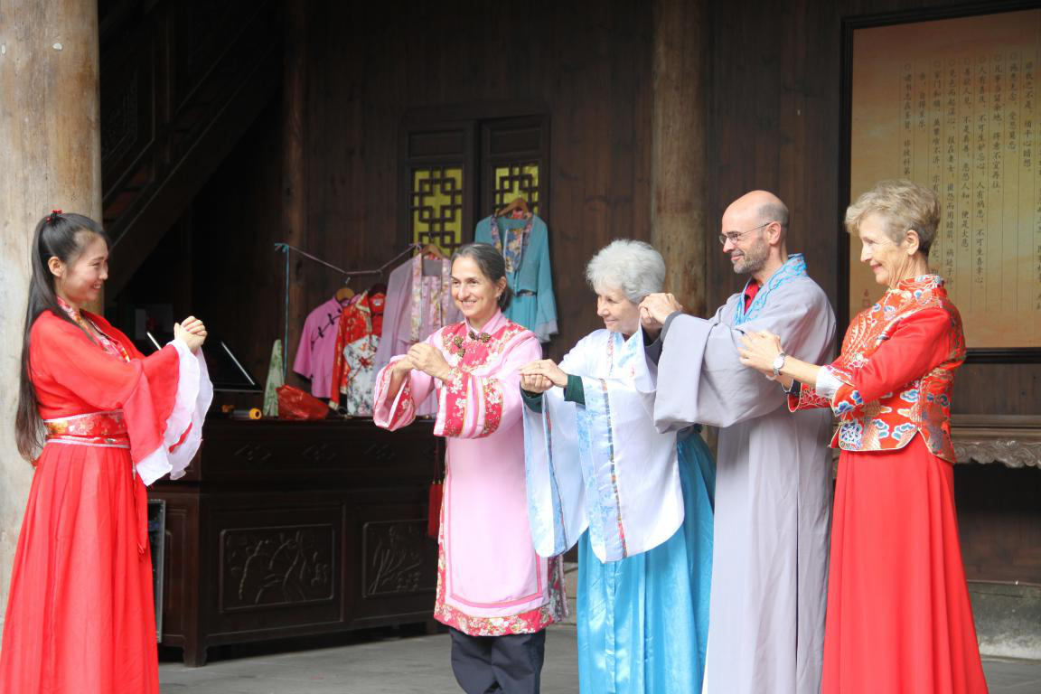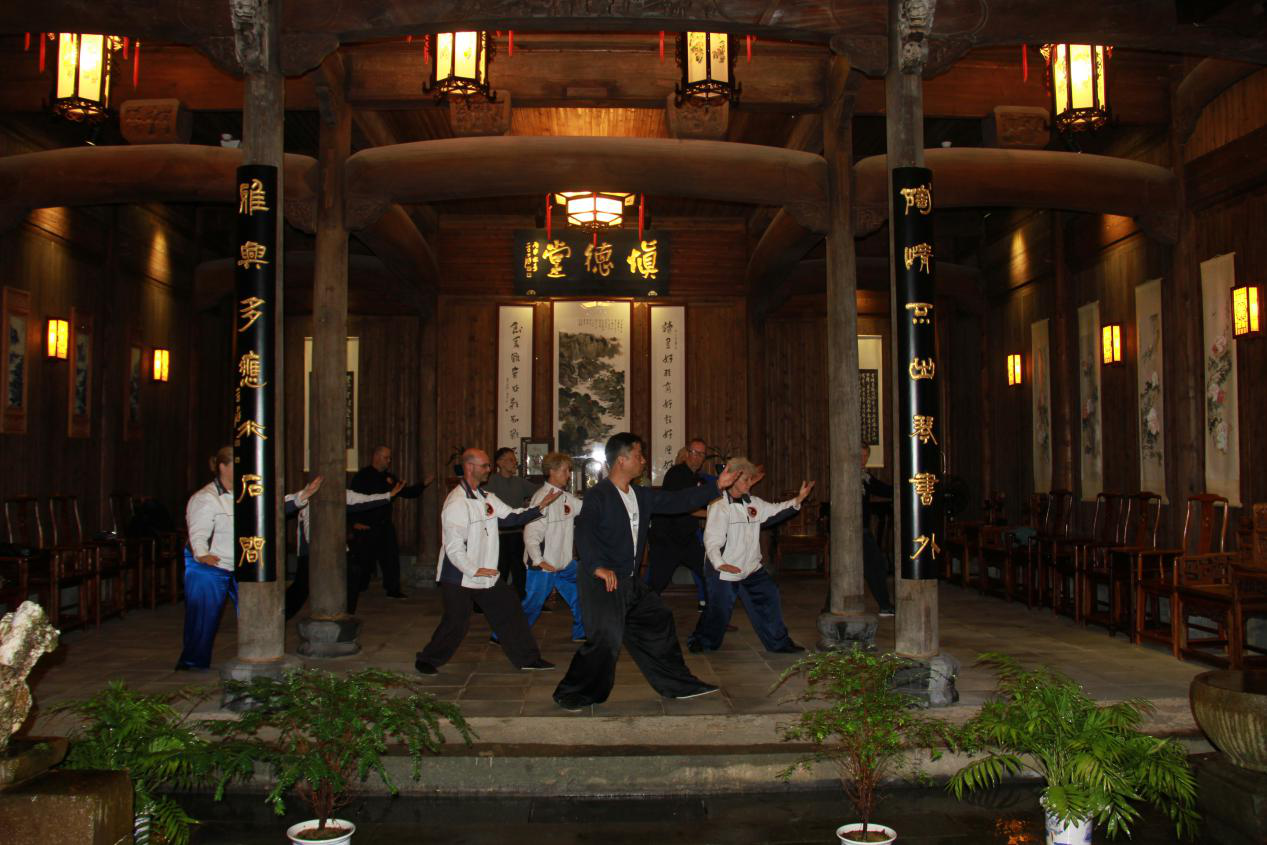 2017年10月16日晚,来自瑞士的太极协会外宾来到了唐模景区,组织了一次别开生面的中西文化交流。外宾们首先来到了唐模法国家庭旅馆,在慎德堂进行了太极演练,17日早上,来到到继善堂欣赏黄梅戏曲表演,并与老师进行互动,展开学习,集体合唱表演。在游览完唐模景区后,瑞士外宾们对唐模的水口文化十分的喜爱,在唐模檀干园的镜亭中进行了一场太极演练。