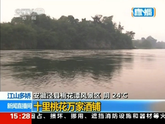 今年国庆,桃花潭景区入选央视“我爱你中国——江山多娇”节目,于10月2日在CCTV1、CCTV13频道的《朝闻天下》、《新闻30分》、《新闻直播间》三个栏目直播景区旅游盛况。电视画面和解说,生动地展示了桃花潭景区秀丽山水、古朴建筑、优美典故与游人如织的繁华景象。节目播出后,立即引起了巨大反响和高度评价,为提高桃花潭景区的知名度和美誉度产生了积极的影响。