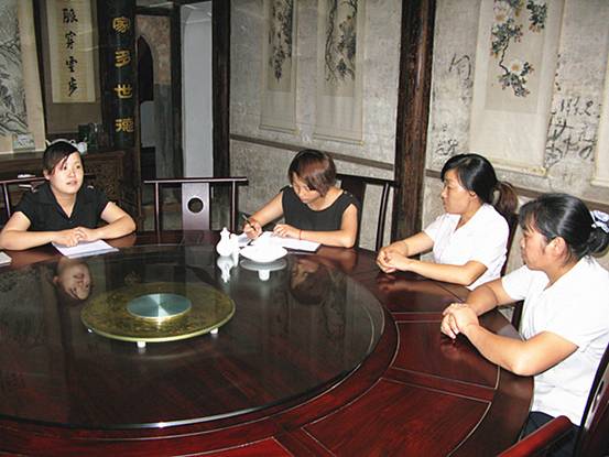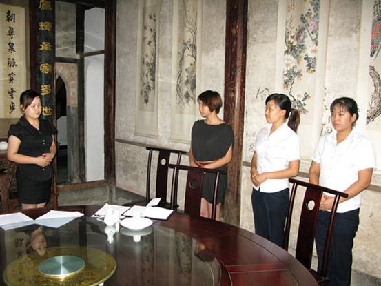 2013年8月3日下午14:00由酒店部运营总监程艳(左一)在景区酒店部(汪应川店)进行了一次酒店服务礼仪培训。