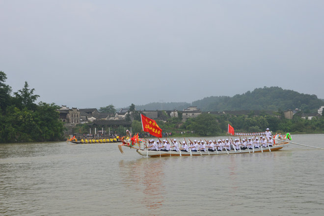 端午节小长假期间,第二届泾县大型龙舟表演赛在桃花潭景区隆重举行?;疃碧欤矫吹挠慰秃偷钡鼐用袢挠行酥碌毓凵土肆廴谋硌?。古老的龙舟号子伴着鼓律,威武雄壮,此起彼伏。精壮的划船者们与龙舟浑然一体,九条龙舟分呈黑、红、黄、蓝、白等九色,盛装一新。欢腾的队伍让游客仿佛感受到了600多年前的汉王”张佑保在桃花潭操练水军的生动场景。