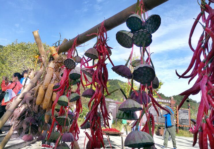 丰收大展台上,摆满了来自当地乡村的绿色无公害农产品,南瓜、红薯、辣椒、板栗、莲蓬、山核桃、花生等众多农特产品,吸引了大量游客参观购买,“品尝着新鲜、地道的乡村瓜果,边观看民俗演出是这次来天堂寨登高踏秋的意外收获”,来自合肥游客赵女士开心的说道。