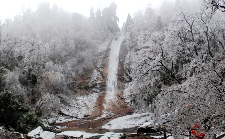 在天堂寨的雪中行走,让人感觉到一种岁月的瘦。有雪的冬天,就像是有酒的盛晏。你看,你看,那在雪中静立的松,就是一幅诗意的雪松图;在雪中盛开的梅花,红得耀眼,却有一阵阵的香气入鼻;在雪中流淌的瀑布,有的变成了冰川,而细细的素湍声,让人听到自然的一种清音。而此刻的白马峰,披上了一层白衣,更显得气势磅礴,威武神气,意韵风发了。枫叶红,青竹翠,在雪的映衬下,更显得美仑了。龙剑峰、将军岩、白象戏水、九影瀑、碧玉谭,在雪中,却不失一份峻峭与清冽,用“千山暮雪”一词来形容山,“冰清玉洁”一词来形容水,天堂寨在人的心里美得如醉了般。