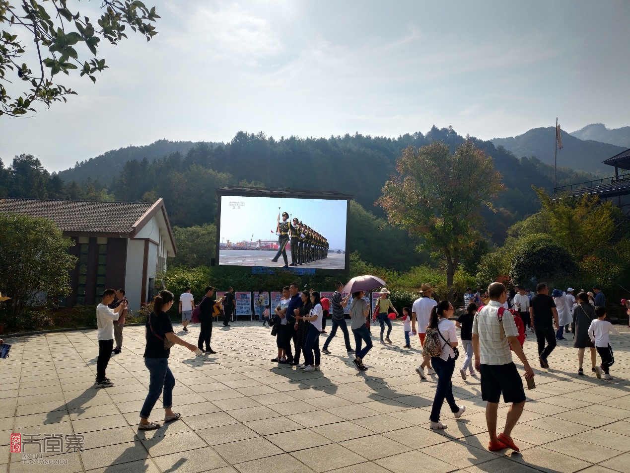 为隆重庆祝中华人民共和国成立70周年,天堂寨景区围绕“整洁、庄重、热烈、节俭”的原则,在主干道、景区入口、滑索入口、天堂寨山庄入口、虎行地停车场、索道入口、生态停车场等地悬挂国旗1200面,景区主干道大圆盘处设置党旗一面、红旗三面,实施公共场所亮化,电子屏直播阅兵仪式,播放《我和我的祖国》,举办歌唱祖国活动,悬挂大红灯笼10余个,派工作人员发放小红旗,摆放鲜花100余盆,设置“壮丽70年 奋斗新时代,热烈庆祝中华人民共和国成立70周年”宣传牌。通过形式多样的美化宣传活动,营造节日氛围,弘扬国家情怀,展现出最美“中国红”,用最喜庆的景区形象庆祝新中国成立70周年!