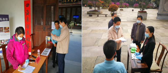 3月25日下午,张业根一行在调研中认真听取了唐模旅游发展公司关于疫情防控、复工复业及经营管理等方面工作情况的汇报,详细询问了唐模景区、法国家庭旅馆采取的疫情防控措施和防控流程等情况,送去了集团公司分发的防疫物资,并现场查阅了游客入园信息登记台账、安康码使用、环境卫生消毒记录、防疫物资发放等,同时叮嘱景区工作人员也要注意做好自身防护。