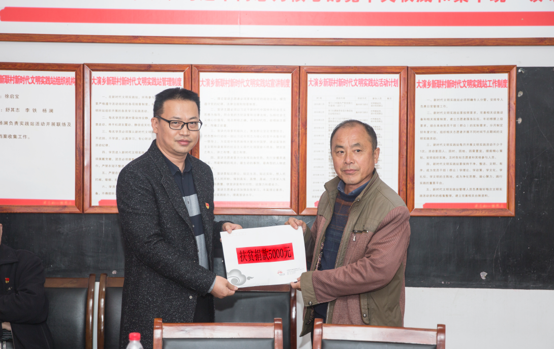 随后,集团物业公司党支部与新联村党支部在新联村村部召开了支部共建座谈会。李铁书记介绍了大演乡扶贫工作具体情况,新联村村支书徐启宝同志介绍了党建工作开展情况,并对村里经济发展情况进行了补充介绍。集团物业党支部书记吴云海同志表示,几年来新联村的村容村貌变化巨大,路好走了,楼房多了,农特产品销售中心也建起来了,驻村工作队富有成效的脱贫工作成绩有目共睹,令人钦佩。集团物业公司全体党员要以驻村工作队为身边的榜样,不畏艰难,不断进取,在工作岗位上努力耕耘,为公司和集团发展贡献力量。会后,集团物业公司副总经理薛江同志代表集团物业公司向新联村捐款5000元,献上了集团物业公司的一份爱心。