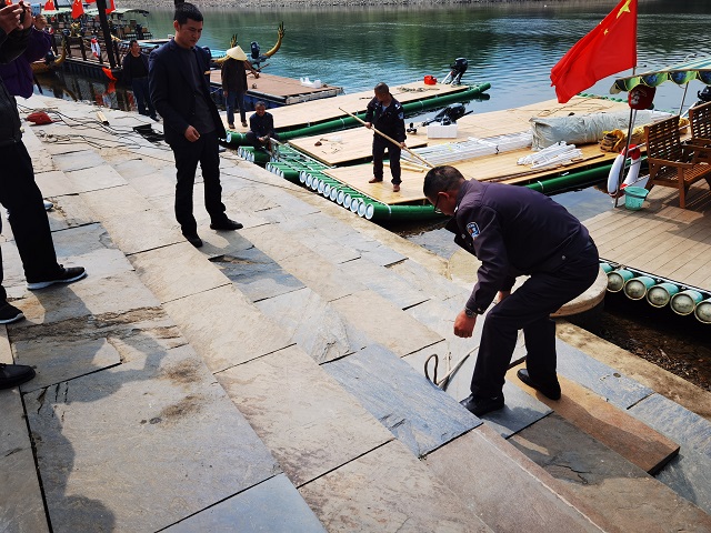 培训演练场景模拟河水突然“暴涨”,严重威胁游客和公司的财产安全,发现险情的工作人员第一时间迅速通过配备的对讲机通报险情,景区负责人立即发出紧急启动应急救援预案的指令,闻令而动的应急救援分队按照预案中划分的“游客疏散组”和“抢险救援组”,及时从不同方位迅速到达出险地点,“疏散组”快速引导游客撤离到安全地带,并拉起警戒线;“救援组”利用防汛器材紧急抢救江边的渡船、龙舟、竹筏及其它经营物资,整个场景分工明确、配合默契、紧张有序、忙而不乱,体现出了高效的救援水平。