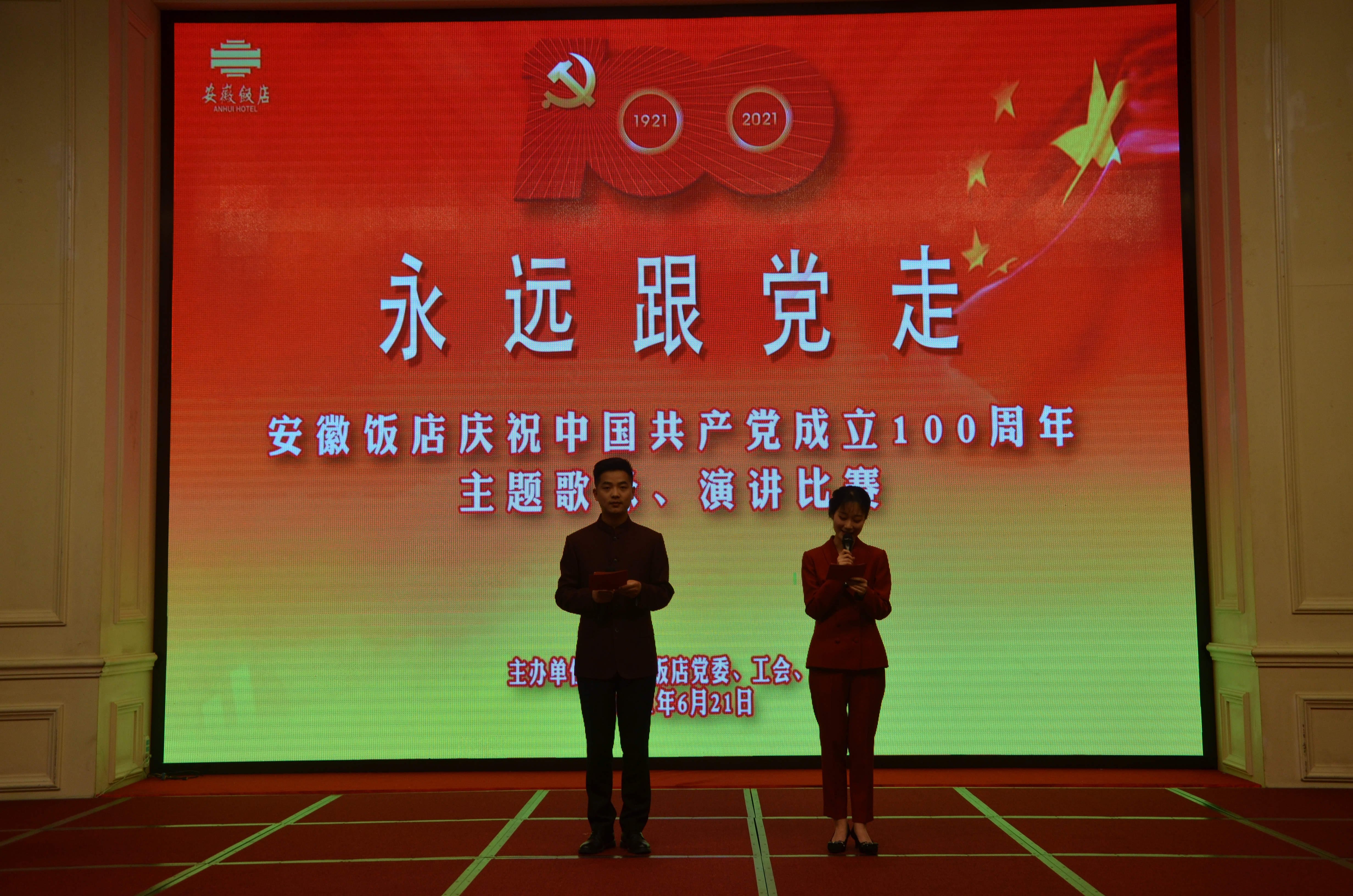 6月21日,安徽饭店党委、工会、团委联合举办的“永远跟党走·庆祝建党100周年”主题演讲歌咏大赛在饭店四楼安徽厅隆重举行。