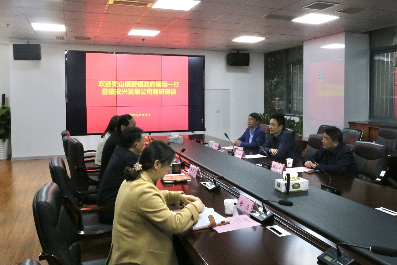 11月16日,吴山镇委书记杨华峰、常务副镇长郑永和一行莅临安兴发展公司考察。发展公司党委书记、董事长毕义友,党委副书记、董事、总裁郑玉怀,总工程师余莉及运营管理中心、综合人事部主要负责同志参加座谈交流。