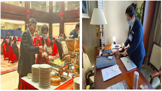 今年政协会正处于疫情防控的特殊时期。为高标准完成接待任务,饭店精心筹划,成立了由总经理张兵为组长的政协会接待领导小组,对接待的每一个环节都认真、反复地研究,多次召开专题会议,分别成立了会议接待组、安全饮食服务组、住宿服务组、维保抢修组、消防安保组、采购保障组和质检宣传组七个专项工作小组。为了切实做好疫情防控工作,饭店专门制定下发了《关于省政协会接待疫情防控工作的通知》,全员核酸检测、填写流行病学史筛查表,会议期间所有直接参与服务保障及间接接触者270人全部实行留置闭环管理,24小时坚守在饭店,随时待命。