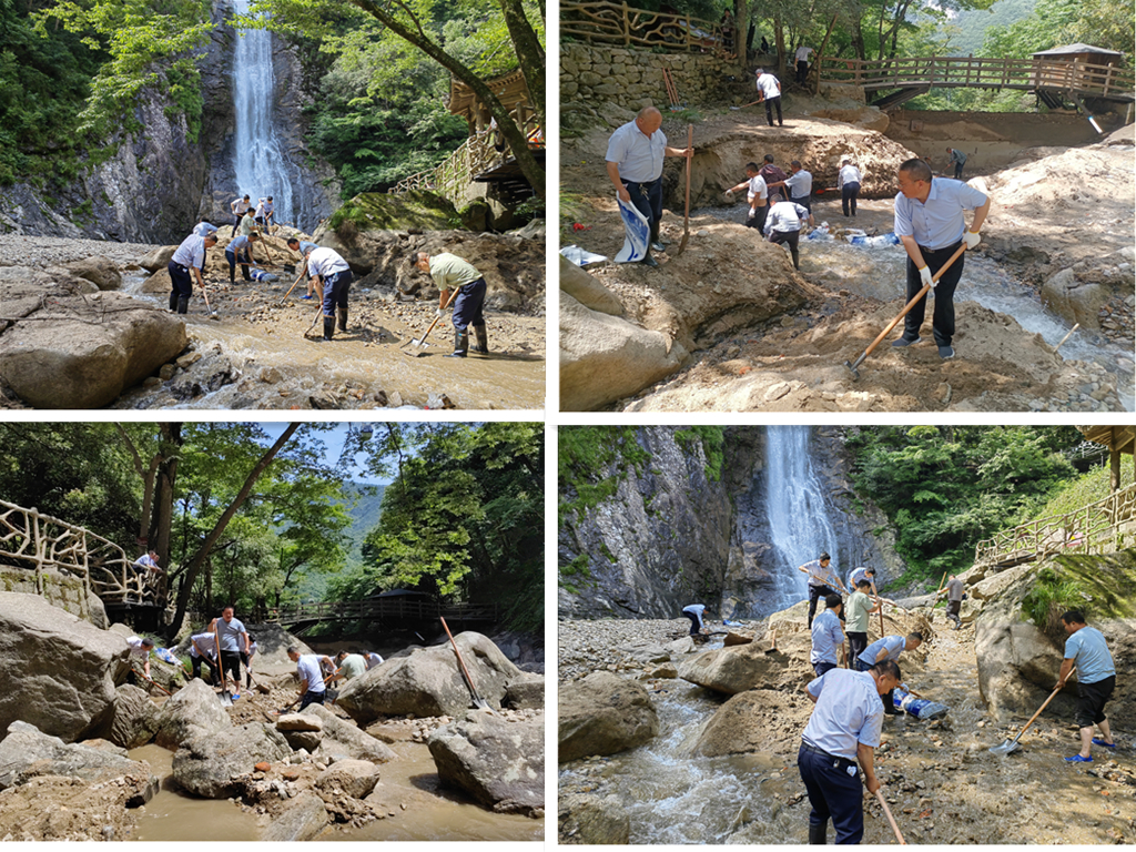 清理现场,公司各部门积极配合,除保障公司正常运转员工外,党员干部、群众员工齐上阵,每天参与近20人次,大家分工合作,撸起衣袖,干劲十足,有条不紊地展开清理工作。经过连续一个星期奋战,基本完成九影瀑仙女潭淤沙清理任务。