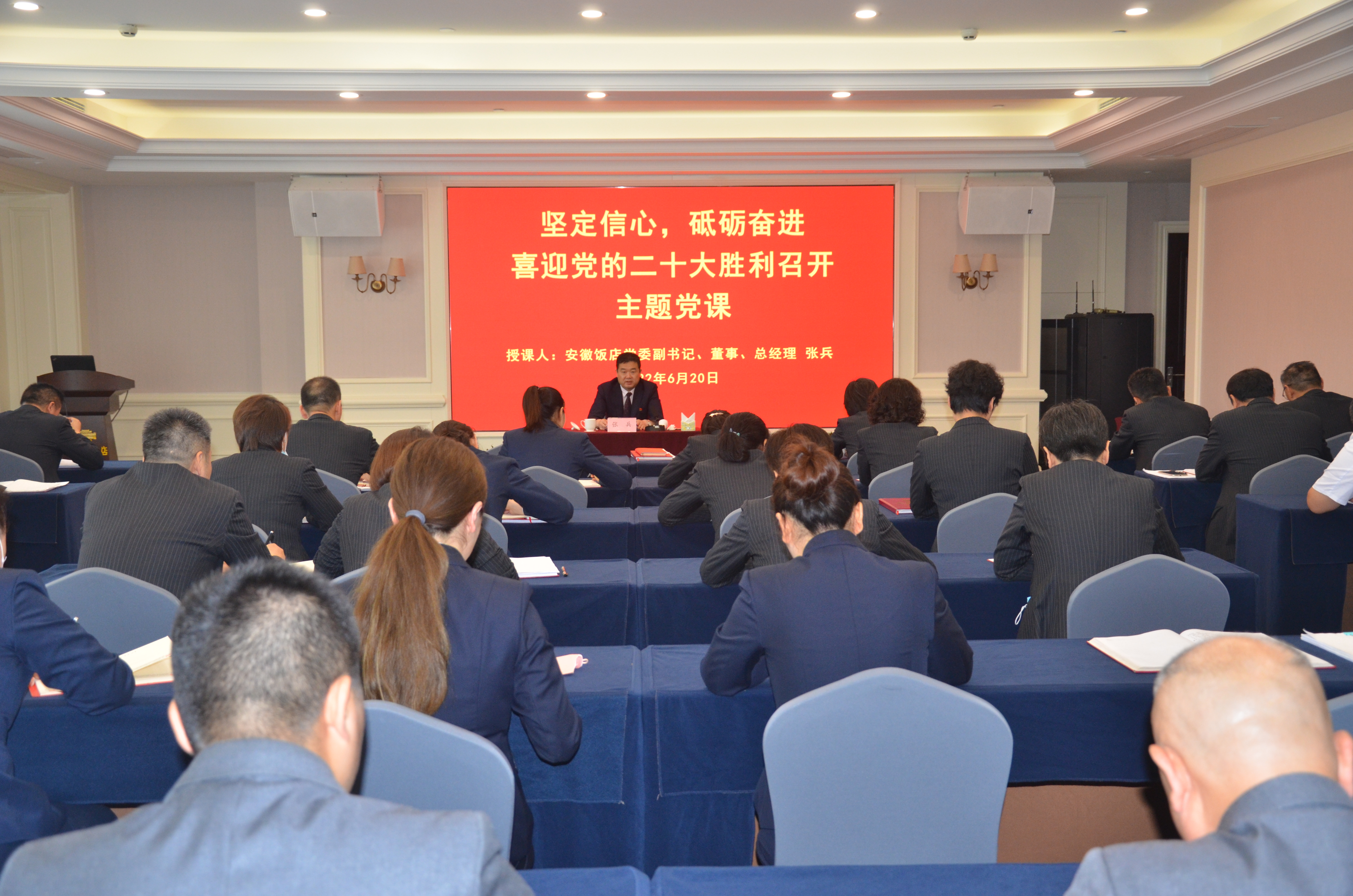 为深入学习贯彻习近平新时代中国特色社会主义思想,不断加强党员队伍思想教育培训,进一步提高安徽饭店广大党员政治意识,6月20日上午,安徽饭店党委副书记、董事、总经理张兵以“坚定信心,砥砺奋进,喜迎党的二十大胜利召开”为课题,为饭店全体在岗党员上了一堂生动的主题党课。