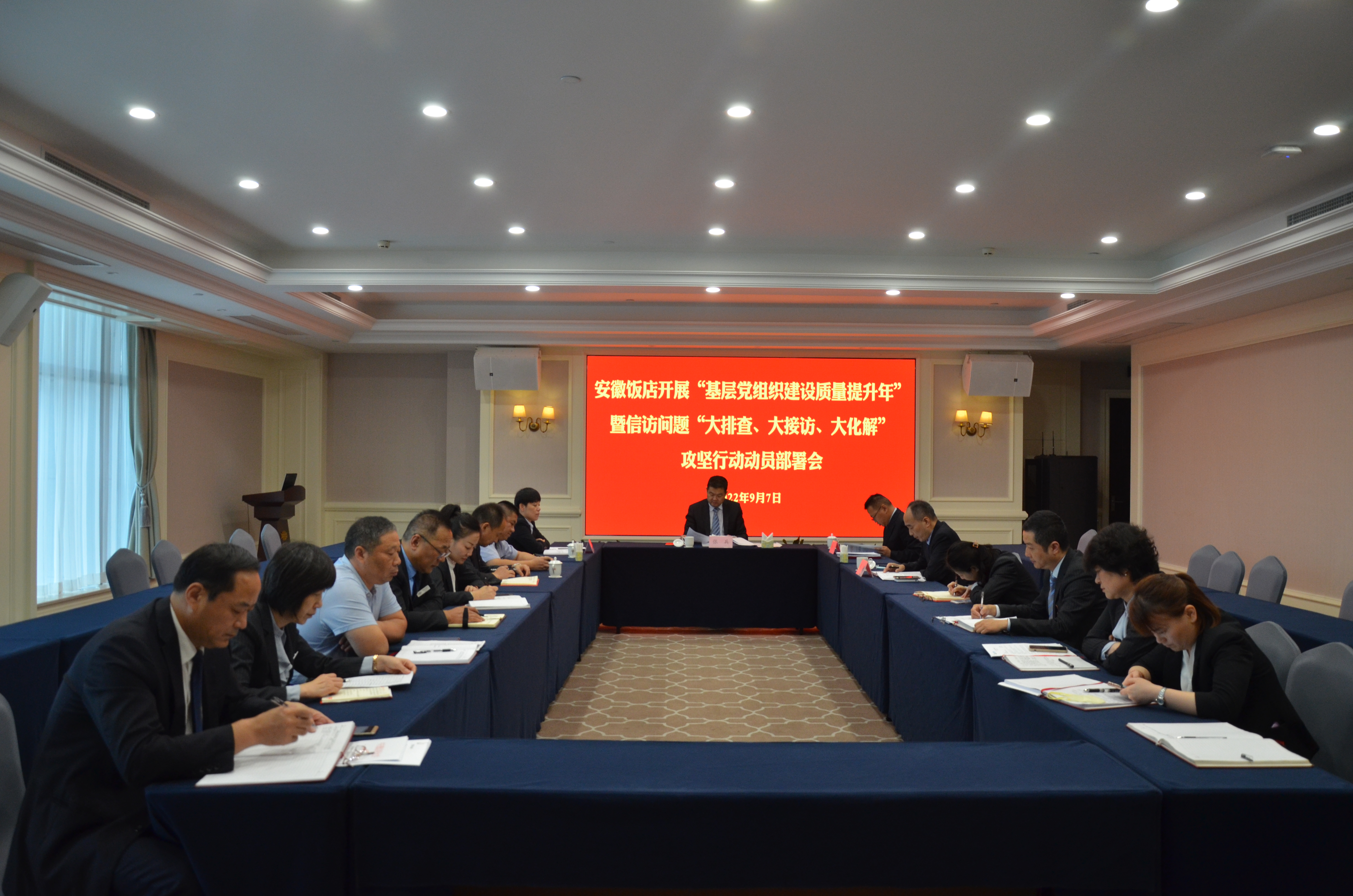 2022年9月7日,安徽饭店召开“基层党组织建设质量提升年”暨信访问题“大排查、大接访、大化解”攻坚行动动员部署会。饭店领导班子成员、各支部书记、各部门负责人参加了会议?;嵋橛煞沟甑澄?、副总经理昂扬主持。