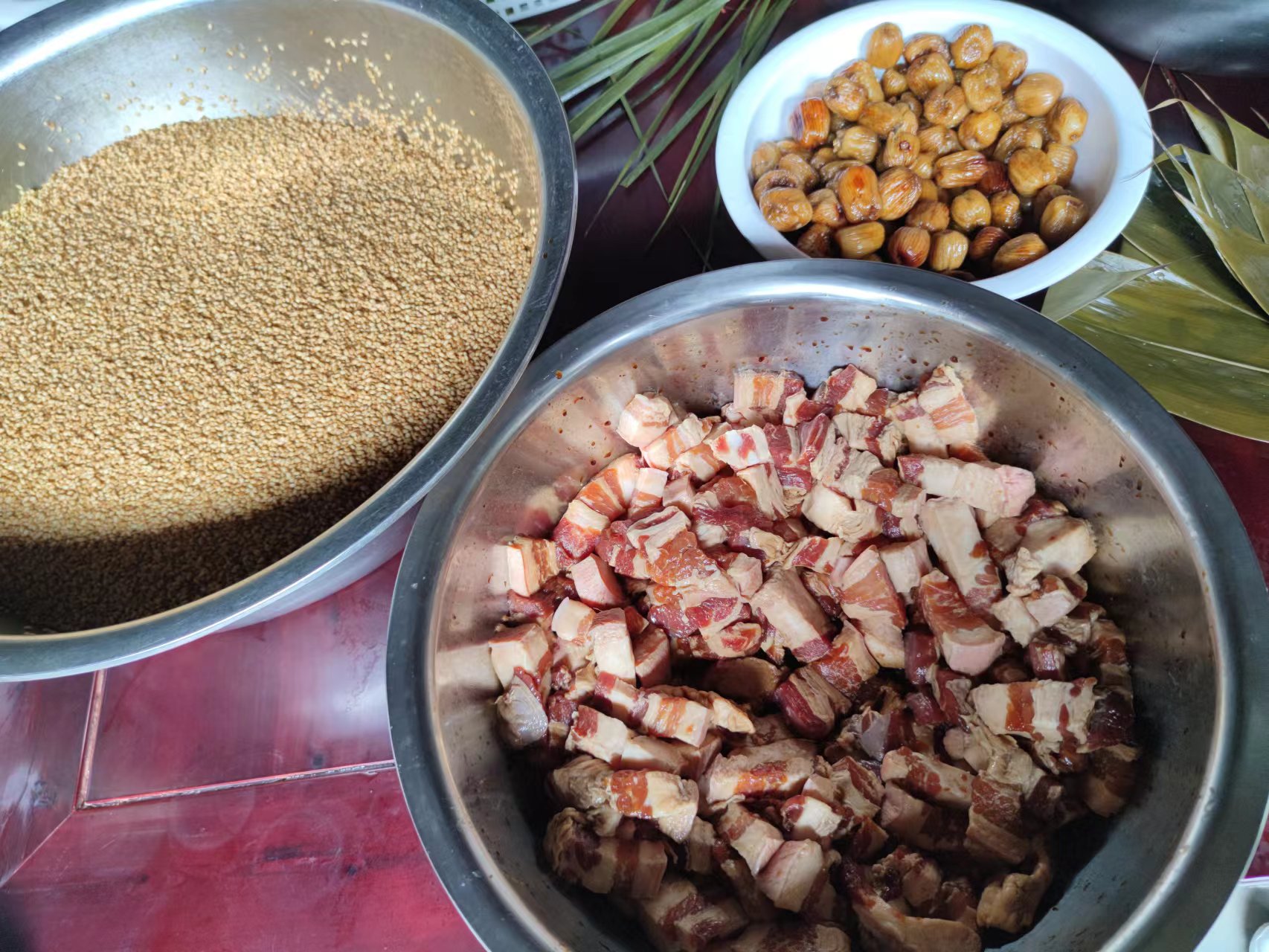 活动前,唐模法国家庭旅馆餐饮部为大家精心准备了粽叶、糯米、蜜枣、猪肉等包粽子所需的各种材料。