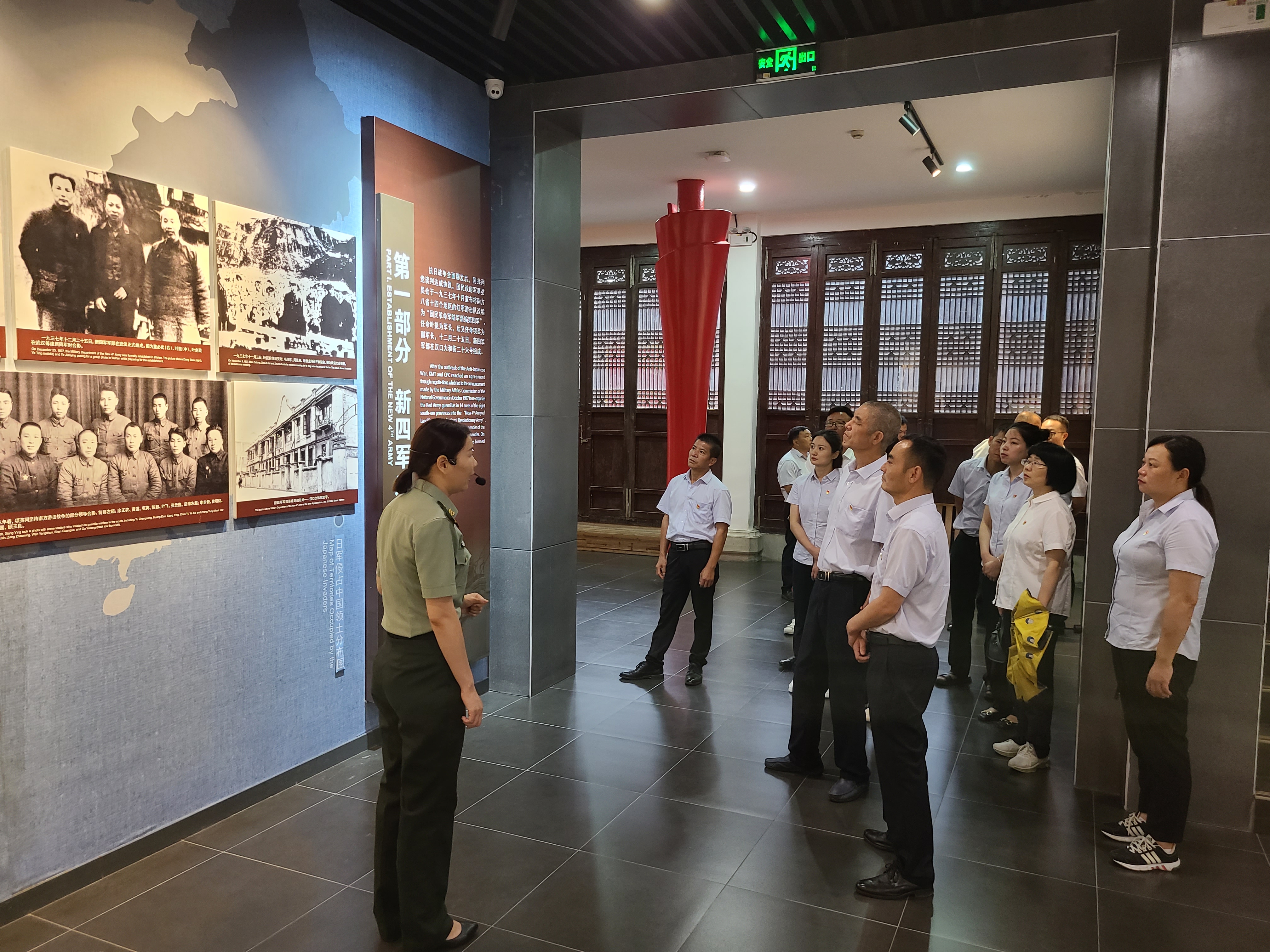 在新四军军部大会堂纪念馆内,全体党团员认真聆听讲解员的生动现场讲解,学习党的历史和革命先烈的光辉事迹,积极传承革命主义精神,从中汲取思想营养,领悟党的初心与使命。大家仔细观看实物和图片,一幕幕感人的革命场景和革命先烈的英勇事迹,让全体党团员再次接受了一次深刻的爱国主义和革命传统教育。